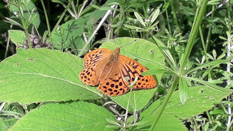 Alex Lack, Bradfield Woods Warden, spotted his first silver-washed fritillary of the year this week. The swooping flight of this large and graceful butterfly is one of the most beautiful sights to be found in woodland during high summer. A large, fast-flying butterfly, it can be separated from other fritillaries by its pointed wings and silver streaks on the undersides which can be viewed as it stops to feed on flowers such as bramble. Although the butterfly is seen mostly in sunny glades and rides, it actually breeds in the shadier parts of adjacent woodland. The main foodplant of the caterpillar is common dog-violet.