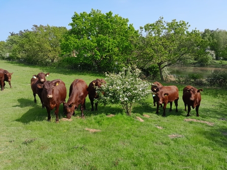 Warden Jamie and the team moved our herd of eight British White cattle from their wintering grounds at Church Farm to their summer grazing reserve at Hen Reedbeds. It looks like they were happy to be back and to get tucked into all that lovely, lush grass!