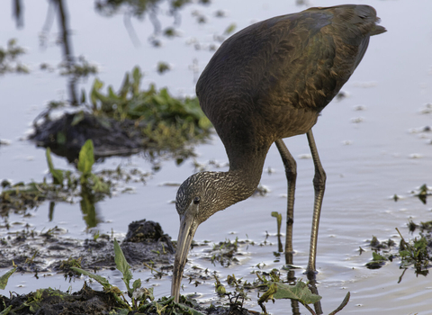 A dark wading bird with long legs, a long neck, and a long, curving curlew-like bill. On closer inspection, the wings, tail and much of the upperparts shimmer with iridescent green and purple. In breeding plumage, the neck and body turn a rich chestnut - in winter, and in young birds, they're a darker brown.